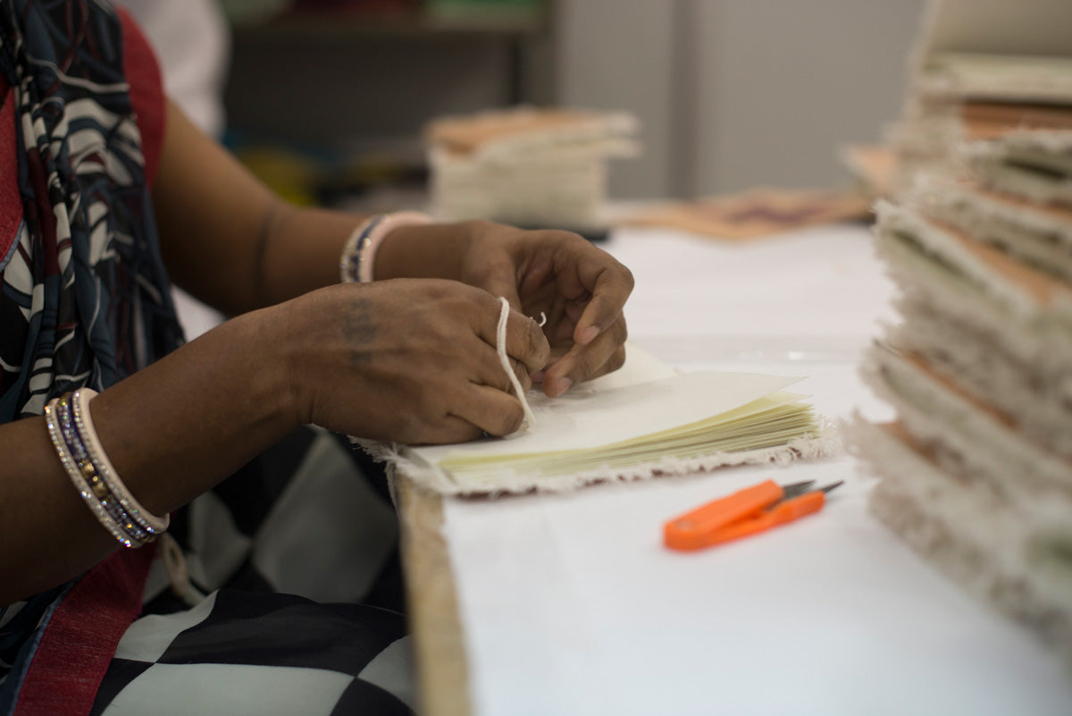 These paper products are made using 100% recycled textile industry waste. Artisans collect discarded cotton scraps, break them down into pulp which is then pressed into sheets, and hung to dry. A delicate process that only master artisans can execute after years of training. This tree-free & eco-friendly paper is then decorated with silk screen patterns.