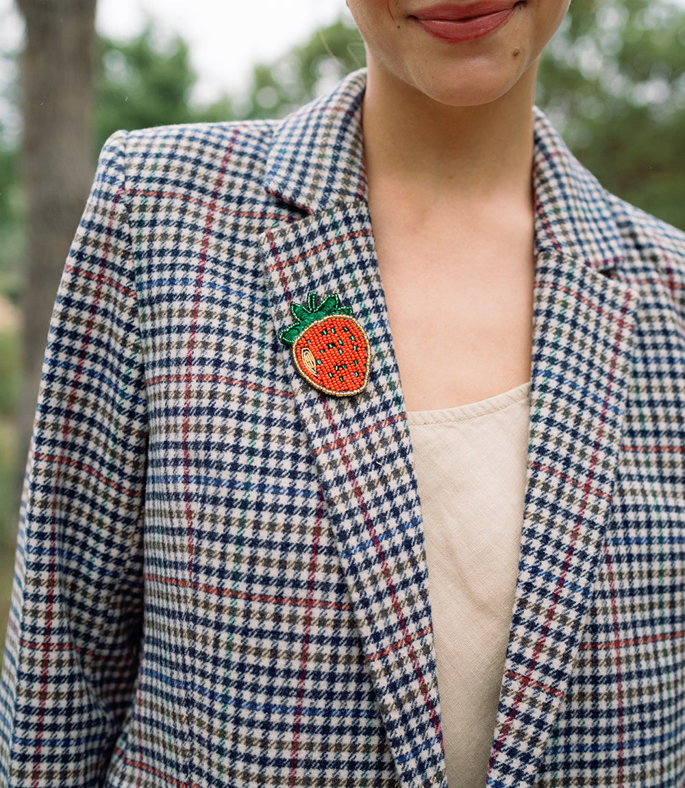 The Bala Mani Beaded Strawberry Brooch Pin is handcrafted by artisan makers in India, who use colorful beads, thread, and sequins to create cute motif brooches. Wear or gift a single pin of a favorite motif or together with other pins to show off a unique sense of style! The strawberry is a cute and versatile motif enjoyed by various generations.