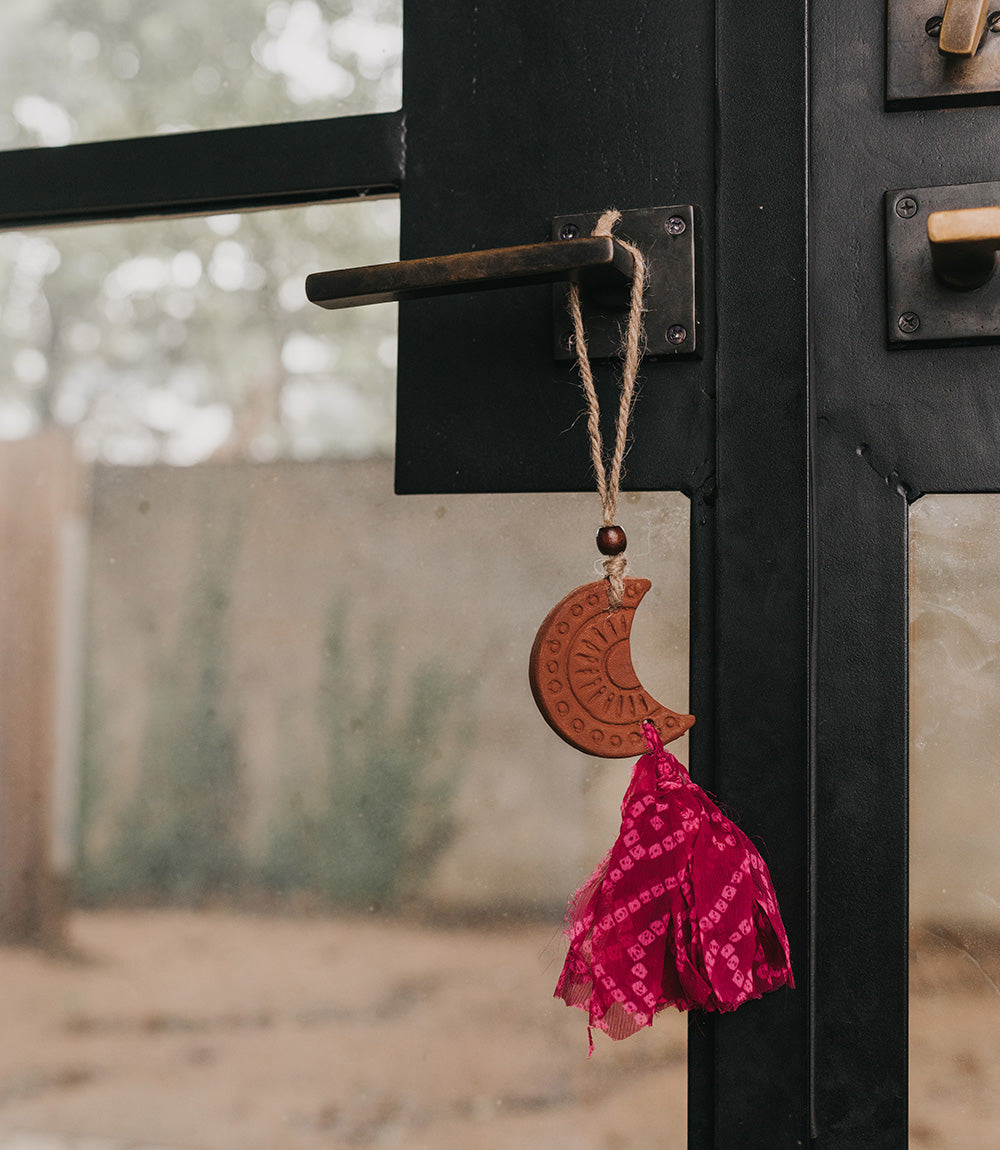 This handcrafted travel aroma diffuser for essential oils features a unique, terracotta diffuser charm in crescent moon design with hand carved accents. The attached tassel is handcrafted with vibrant, assorted, upcycled Indian textiles. The diffuser includes a sturdy jute hanging loop, nicely sized for sliding over a car mirror.