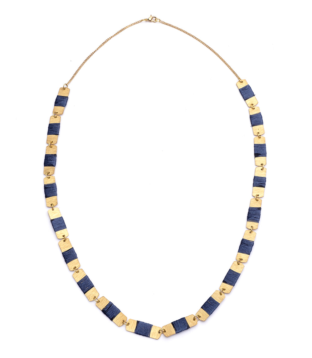 This handcrafted long necklace features gold finish dog tag style link charms with navy blue thread wrapping.