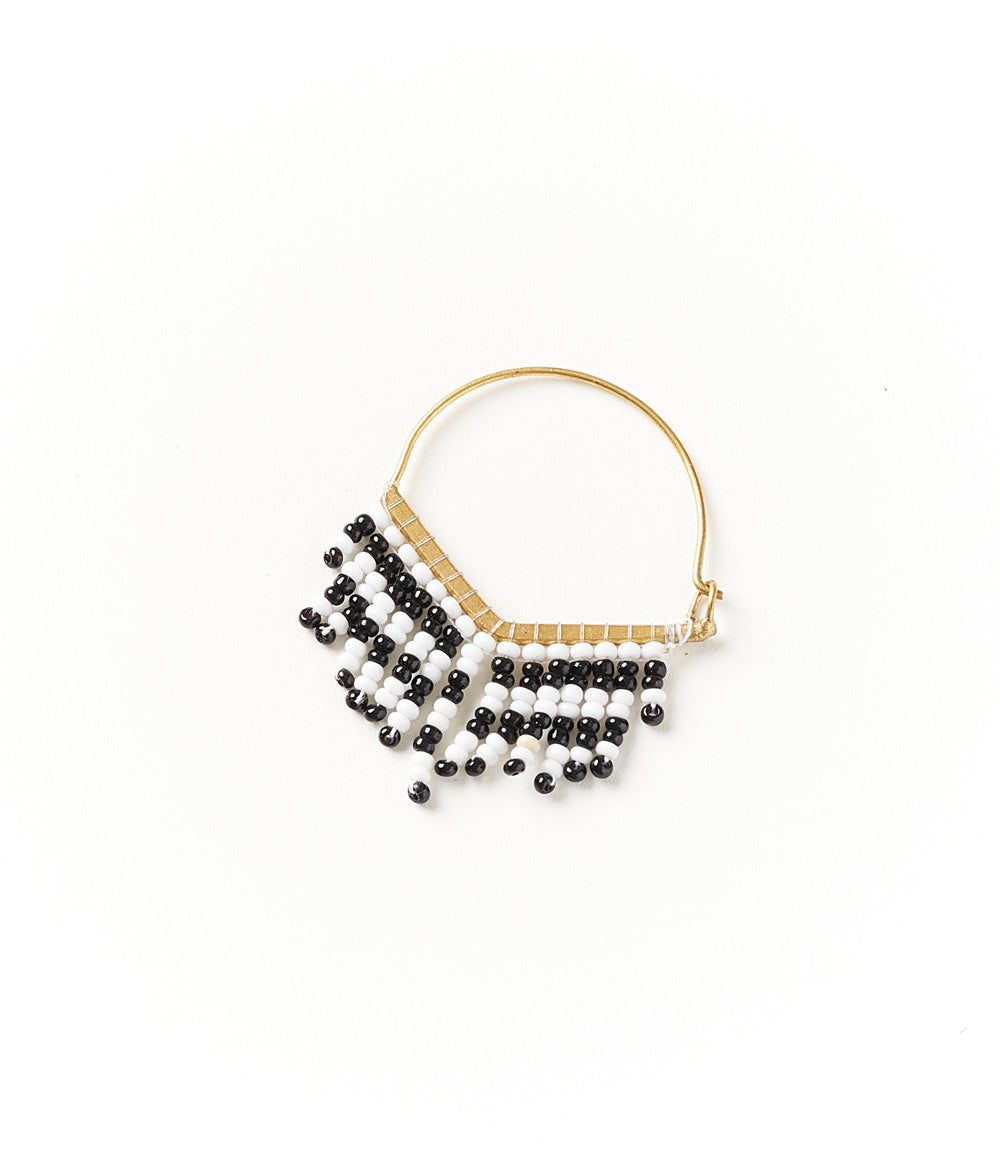 Our fiery Kalapriya Collection applies generations old jewelry making techniques in eye-catching, boho chic designs featuring refined gold tone on brass elements and tasteful bead fringe. These handcrafted hoop earrings feature shiny, gold finish ear wires with black and white stripe bead fringe in chevron design. Traditional jewelry making techniques of Old Delhi are thoughtfully applied in this modern design.