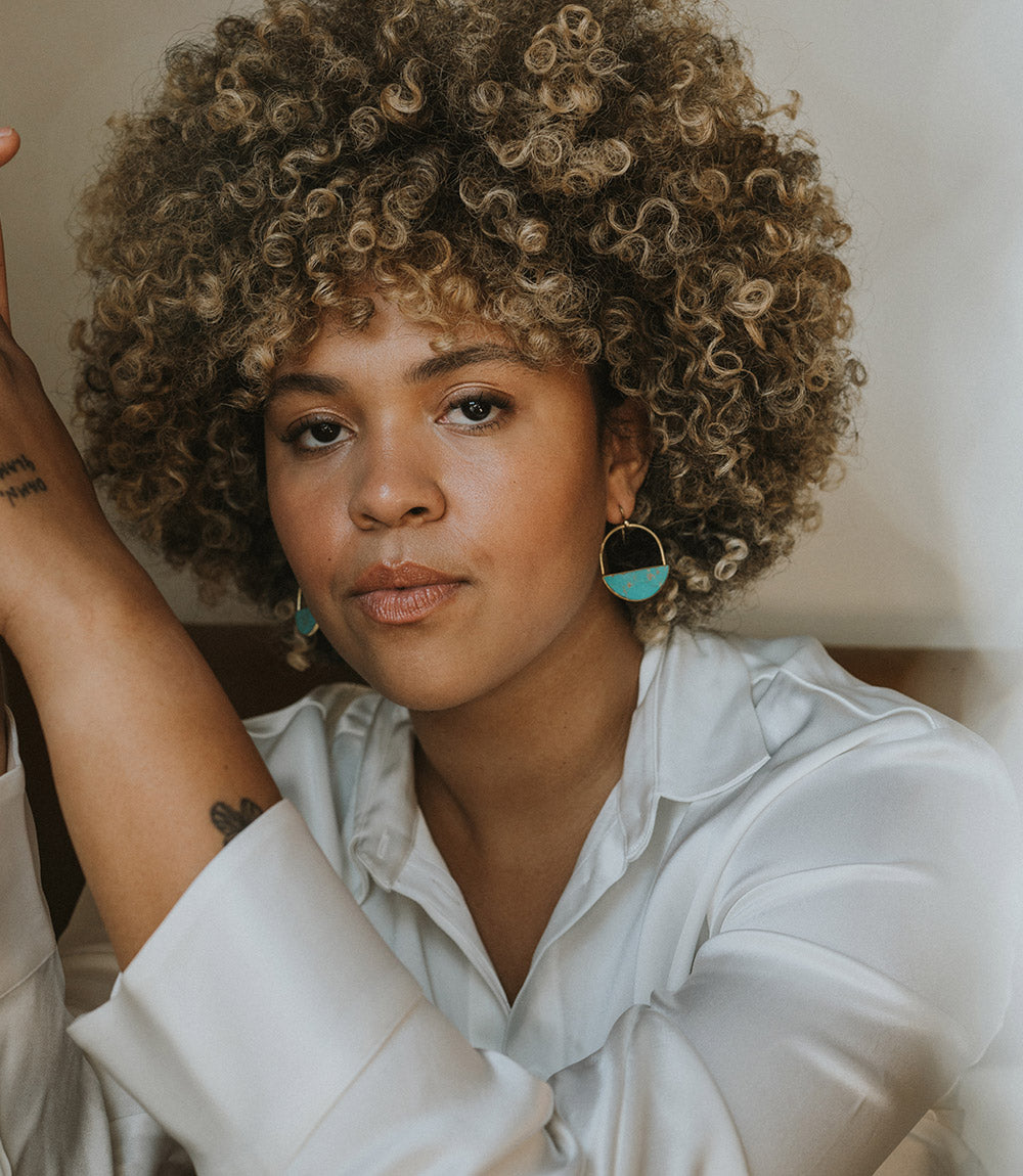 Our energetic Sandhya Collection combines reconstituted stone charms and handcrafted brass on gold tone elements in eye-catching, boho chic designs. Traditional jewelry making techniques of Old Delhi are thoughtfully applied in this modern design. These handcrafted drop earrings feature a unique linked design with bezeled, reconstituted semiprecious stone slice charms and shiny, brass gold finish accent charms.