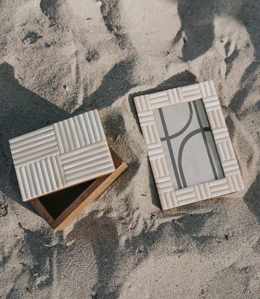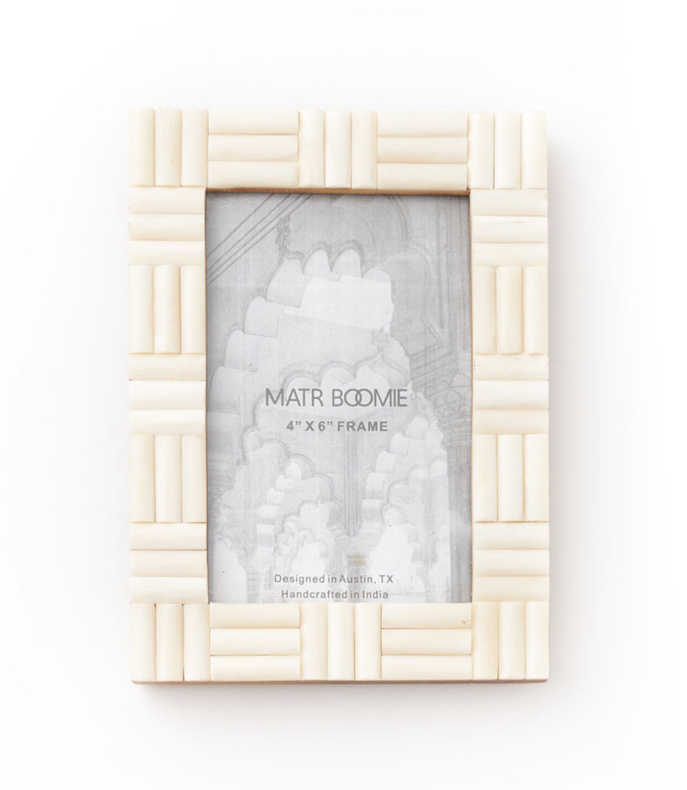 Vaishali stands for an ancient city of India, the birthplace of a god in Indian mythology. The rounded grid bone tile used in this 4x6 photo frame is handcrafted by artisan makers in India who traditionally carved other raw materials and now use cruelty free, ethically sourced bone to create functional products for the home. The picture frame features a two way kickstand and two d-rings for convenient table top or wall display. Holds 4x6 photo or print and can be easily accessed with metal swivel tabs and removable back. Buy together with other items from the Vaishali Collection to merchandise together in your store or website.