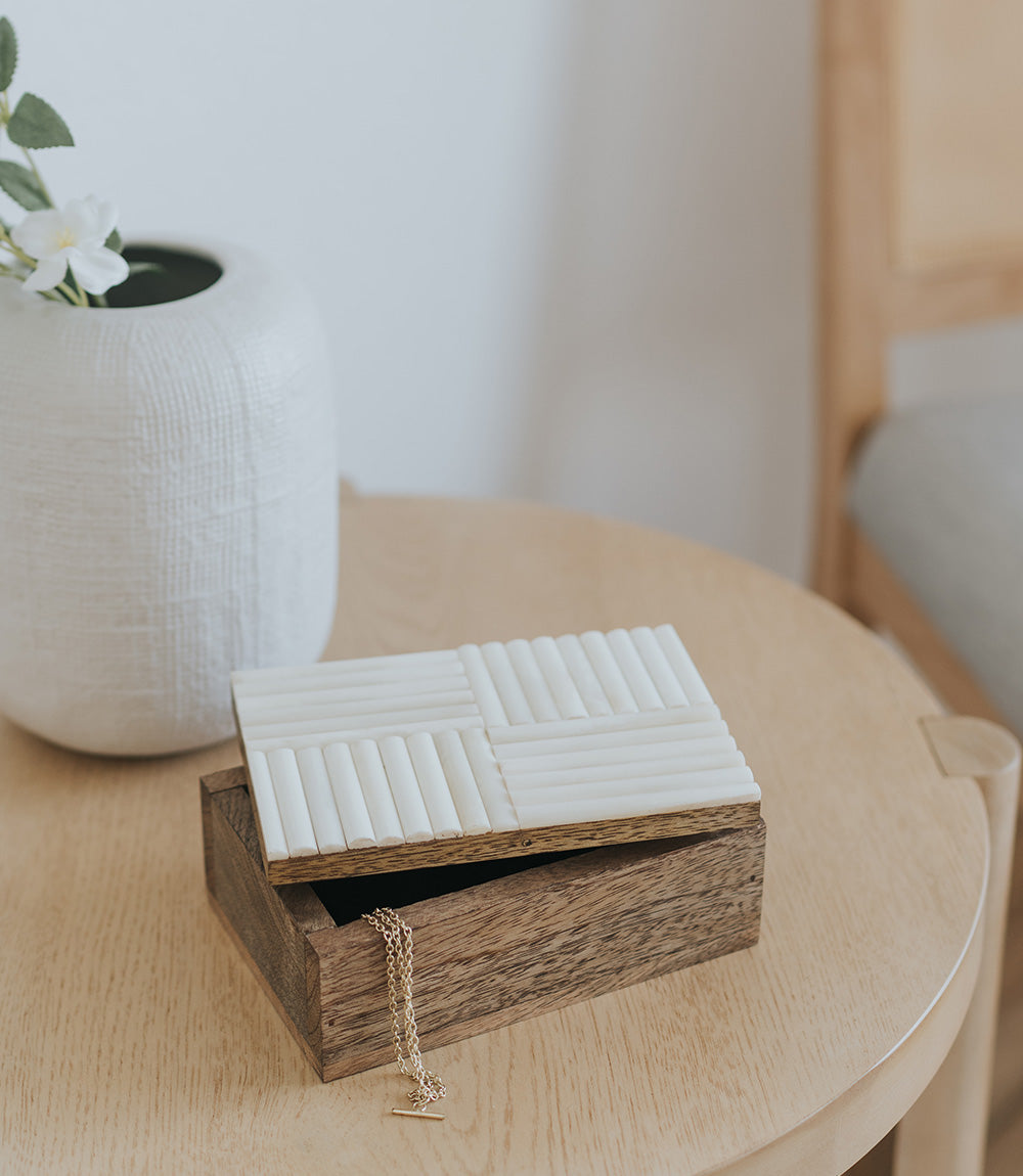 Like it's name the Vaishali Collection is a refined design inspired by the age old traditions of India. Artisan makers in India who traditionally carved other raw materials now use cruelty free, ethically sourced bone to create functional products for the home. This storage box features bone tile in a raised, ribbed effect on the lid and a mango wood box. The neutral colorway and classic design make it a versatile all around gift. Display with other items from the collection.
